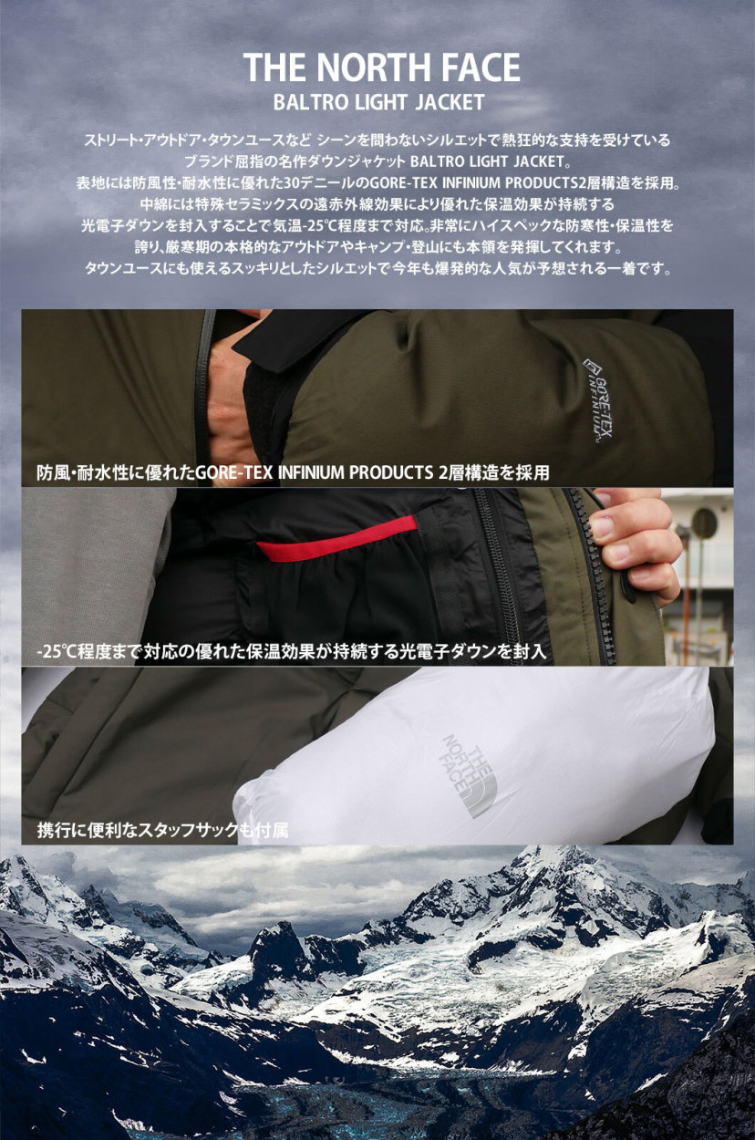 THE NORTH FACEからBALTRO LIGHT JACKETのご紹介。真冬の天体観測や雪上ハイクにも対応できる、高い保温性を持つ防寒ジャケット。中綿には、特殊セラミックスの遠赤外線効果により優れた保温効果が持続する光電子®ダウンを封入。高度な洗浄技術により、汚れを徹底的に除去したクリーンなダウンが高い保温性を確保します。表生地には30デニールのGORE-TEX® Infinium WINDSTOPPER®2層構造を使用。防風性とともに耐水性もあり、雪や小雨程度の濡れを遮ります。中綿入りの内襟や前ファスナーのダブルフラップなどでコールドスポットを徹底的に排除。携行に便利なスタッフサック付きです。