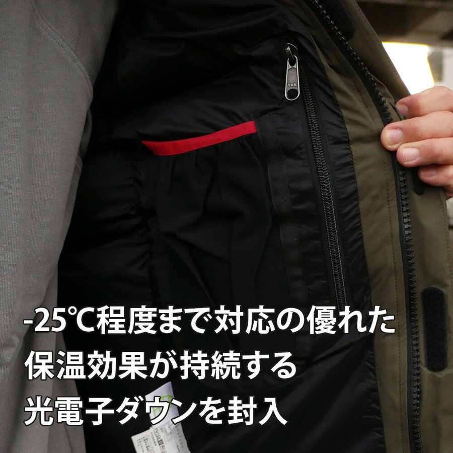 機能:優れた防風性と高い保温性を持つ防寒ジャケット/スタッフサック付/裾ファスナー付ハンドウォーマーポケット/裾ドローコード仕様/ファスナー付内ポケット/両胸に止水ファスナーポケット/ワンハンドアジャスター対応フーデット/ダウン入り内衿仕様/フロントダブルフラップ仕様/内側に2つのストレッチポケット